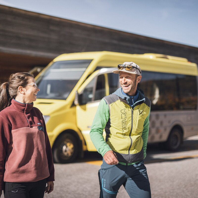 If you arrive by train or bus in South Tyrol you can use the "Südtirol Transfer”, a region-wide connection shuttle for the last few kilometres to your accommodation. You can get to your holiday accommodation from the train stations in Bolzano/Bozen, Meran/Merano, Mals/Malles, Brixen/Bressanone, Bruneck/Brunico or Innichen/San Candido, as well as from the ‘Flixbus’ bus stops in Bolzano, Meran or Klausen/Chiusa and after your holiday you will be brought back to the de-sired stop. The group transfer to the South Tyrolean accommodations can be booked online.
