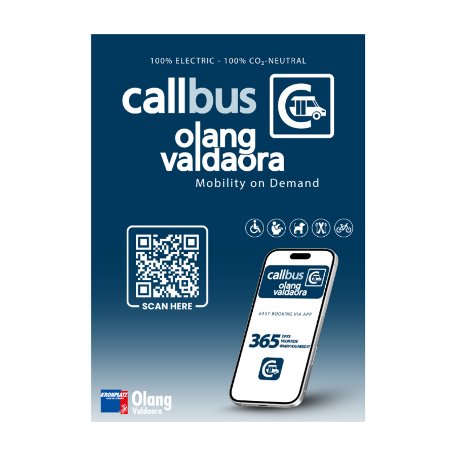 The CallBus contributes to a more sustainable, flexible and simplified mobility in Olang. With its on-demand service, the it is available exactly when and where it is needed. Starting in November 2025, it will complement Olang’s public transport service, accompanying guests and locals directly to their destinations – without scheduled timetables or the need for private cars. When required, a barrier-free bus is available for people with disabilities.
